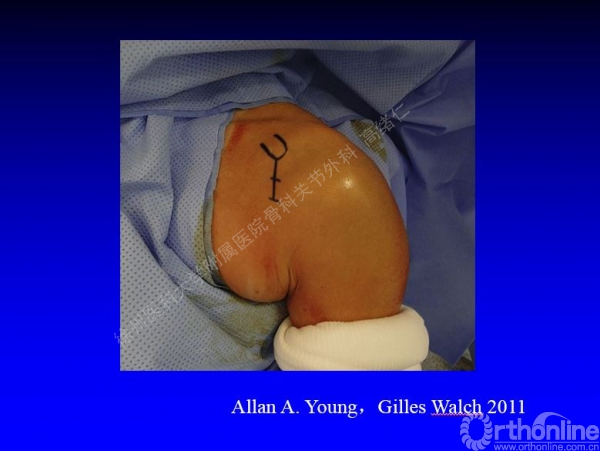 沙滩椅位。患臂铺单后要能自由活动,尤其是做外展和外旋活动。肩峰外侧缘要平行于手术台。肩胛骨和台子之间要垫个小毛巾以使肩胛骨可放平并稳定肩胛骨。