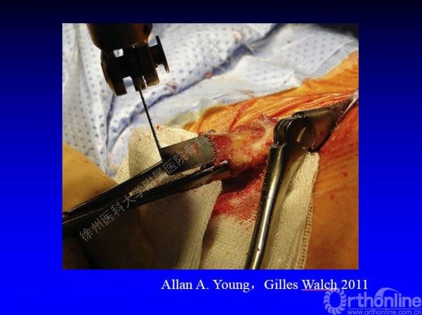 现在就可以看到喙突的膝部,即喙突的水平部和垂直部相连接的地方。这就是截骨的位置。从这儿可以截取2.5厘米到3厘米长的喙突。用90度的摆锯从内侧向外侧截取喙突。重要的是要确保截骨垂直于喙突,这样就不会误入肩胛盂关节面。如果有必要的话,可采用骨刀辅助截骨。