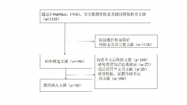 ③非中文或英文的相关文献。总计检索到1318篇,其中英文文献622篇,中文文献696篇,依据纳入排除标准最终纳入文献40篇,中文21篇,英文19篇(图一)。