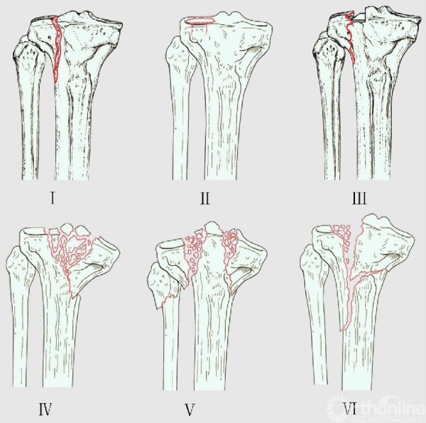 图二:I型:外侧平台劈裂骨折;II型外侧劈裂压缩型骨折;III型外侧中央型压缩骨折,压缩部分可涉及前方、后方或者全平台;IV:内侧平台劈裂或凹陷性骨折;V型:双侧平台劈裂骨折,胫骨近端干骺端连续性仍然完好;VI型:干骺端连续性被破坏。