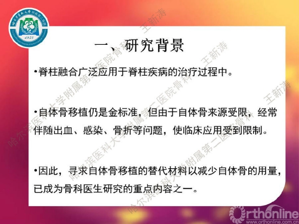 脊柱融合术现在已经被广泛应用于脊柱疾病的治疗过程当中,在众多脊柱融合方法中,自体骨移植仍是一个金标准,但由于自体骨来源受限,经常伴随出血、感染、骨折等问题,使临床应用受到限制。因此,寻求自体骨移植的替代材料以减少自体骨的用量,已成为骨科医生研究的重点内容。针对这种现状,哈尔滨医科大学附属第二医院王新涛教授介绍了他们的研究成果。
