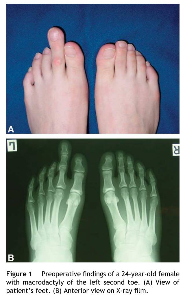 24岁的女性患者左足第二趾巨趾畸形。父母发现在3岁的时候第二趾和其他趾体生长速度不一样,但是没有接受任何治疗。父母主诉外形不美观的痛苦大于功能。患者行走和跑步没有问题。其他么有合并畸形。在趾甲的部位测量,比正常的足趾长15毫米和厚15毫米。患趾功能和感觉正常。拍片显示跖骨和趾骨增大。近节趾骨7毫米,中节趾骨5毫米,末节趾骨4毫米,同对侧比跖骨长4毫米。其余趾体同对侧大小一样。