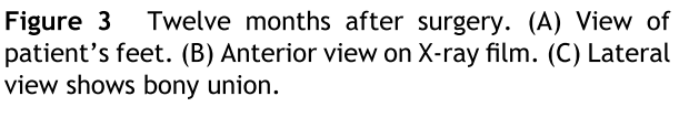 尽管我们推荐截除末节趾骨使巨趾长度和周围保持一致,但是患者希望能保留趾甲。所以我们根据以前移植趾甲修复手指设计了趾甲皮瓣来保留巨趾的趾甲。术前设计皮肤的切口确认趾甲的长度和大小和对侧相等,在全麻和止血带下,趾甲瓣被窃取下来,血管蒂为第二趾的指固有动脉,部分末节趾骨保留在趾甲下面约2毫米,其余的末节趾骨部分从关节处分离解脱。骨头通过钢丝捆扎固定,术后5周去除。术后6个月,患者站立时间产后会有轻微的疼痛和肿胀。在术后12个月后,这些症状改善,患趾大小和对侧接近,骨愈合良好。对手术效果非常满意。