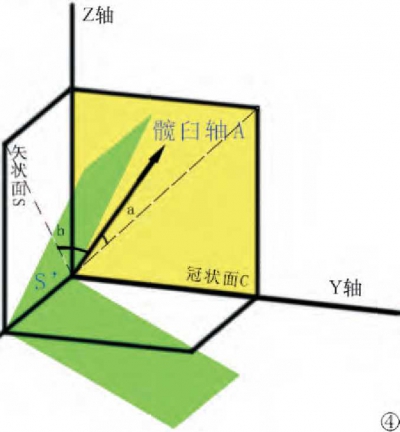 将上述步骤简化成坐标图,设冠状面为C,矢状面为S,髋臼轴为A,骨盆旋转后矢状面为S',C与S垂直,A与C成角为前倾角a = 15°,A与S成角为外展角b =45°,骨盆前旋转角度定义为+α,后旋转角度定义为-α。运用解析几何原理,两个向量夹角余弦公式,经过推导,可以得出如下公式: