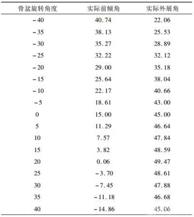 表1 骨盆旋转角度与实际髋臼角度变化趋势(°)
