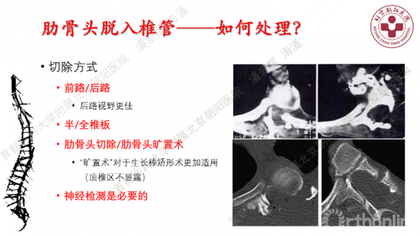 多数学者认为脊柱矫形之前行肋骨头切除术是预防和治疗神经损伤的主要方式。切除的方式分为前路/后路肋骨头完整切除和只切除椎间孔外侧部分肋骨而保留椎管内肋骨头的“旷置手术”。