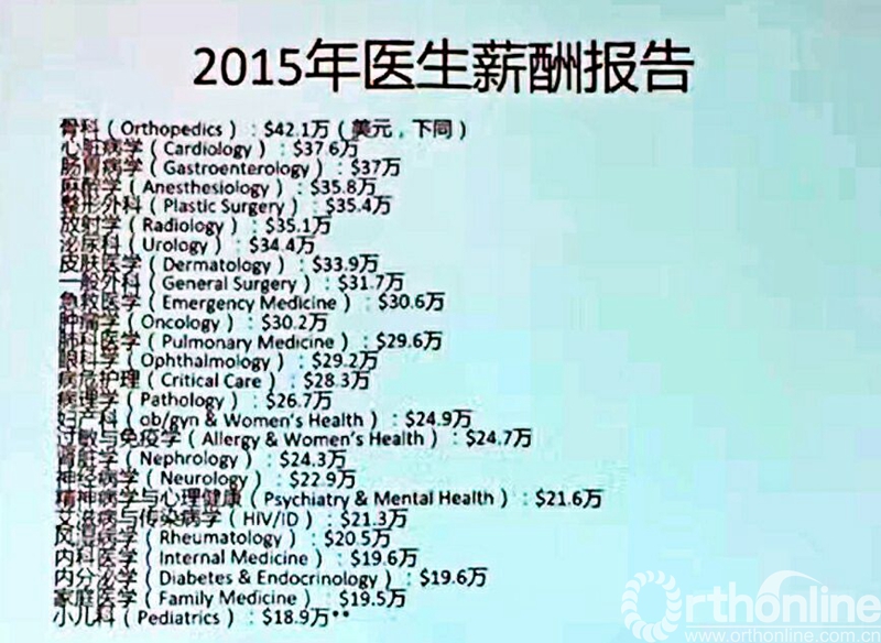 美国医生的专业职称分为:Attending Physician(主治医师)、Fellow、 (住院医师,第一年叫intern ,以后都叫Resident),Resident的年收入约3万~8万美元,逐年增加。 Attending Physician就是最高的专业职称,Department Chief(相当于国内的主任和医疗组组长)只是行政职务,美国骨科医生的平均年收入大约42万美元。