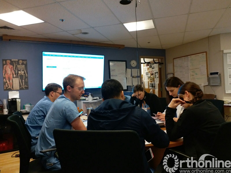 周四大讨论,6:15开始,依次进行新病例讨论、术后病例回顾和文献学习,每个专业学习一篇(脊柱、关节、创伤、小儿、运动医学),最后有各专业的Chief做总结。老美对专业的钻研很认真很拼,这一点值得我们去学习。
