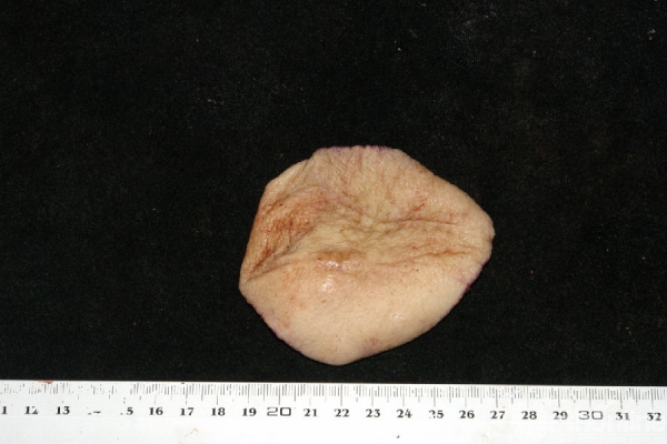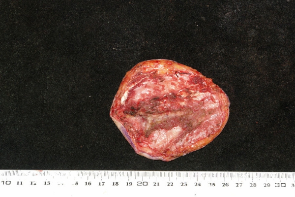 5.治疗:入院后行手术治疗。取距原手术切口3cm做皮肤切口,于肿块外正常软组织2cm,包含皮肤、皮下组织、肿块、深筋膜及其深层的肌肉整体切除,以同侧背阔肌肌瓣旋转后经腋下、上臂后侧皮下隧道覆盖软组织缺损,再以所取之背阔肌肌瓣之表层全厚皮片作游离植皮覆盖伤口。切下之肿物(图4 标本大体像)切面呈灰白色,质地中等。