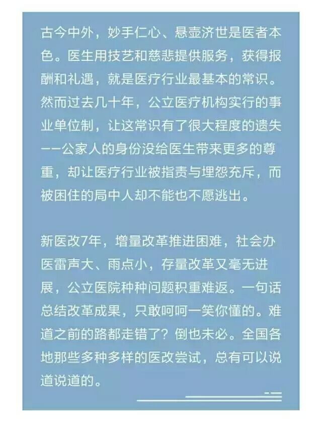 人一想开,心思也就活了,医生队伍的活力就激发出来了。通过访谈我们发现,面对公立医院改制的浪潮,医生们的想法和出路大有不同。家里有点儿钱的、有想法的医生觉得,反正没了编制,替别人打工不如替自己打工,决定加入购买医院的资本大军;家里没钱但有能力的医生就想着,资本入股不行我就技术入股、能力入股,成为医院管理层,换一种方式为自己打工;而那些想法、能力、医术都中不溜的医生,大多随波逐流,觉得在哪打工都是打工,哪家医院要我,我就去哪家医院。