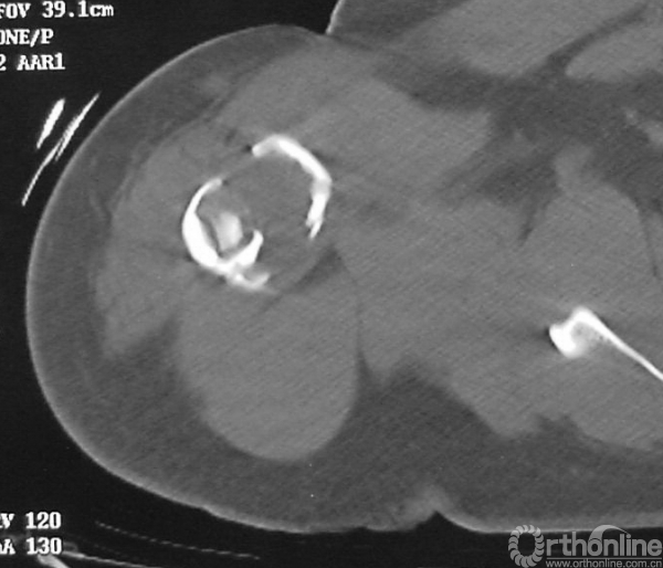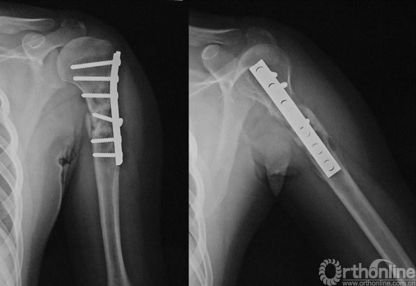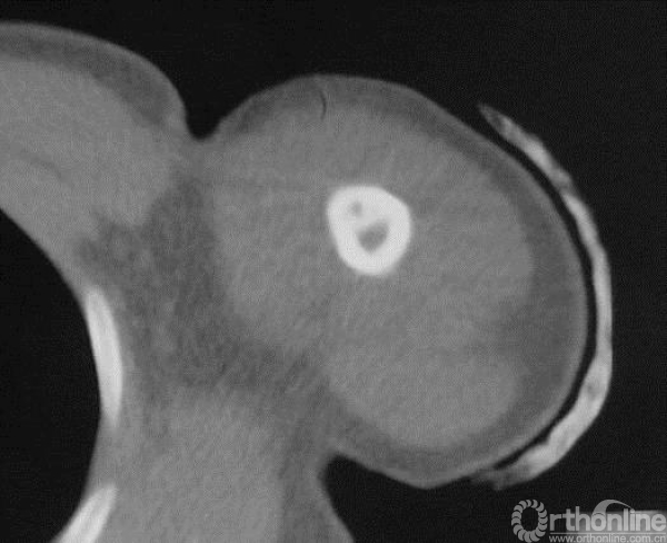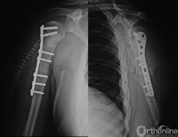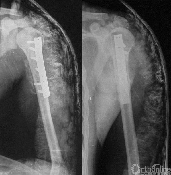 术前未行化疗,手术行“左肱骨上段瘤段截除、异体骨置换、钢板内固定术”。肱骨上端肿瘤切除后骨缺损的重建有多种方法,肱骨上段骨缺损重建因肩关节结构的特殊性,依肿瘤学的要求行肿瘤外科学的广泛切除,导致肩袖软组织缺损,术后肩关节稳定性差,常常出现肱骨头向前上方脱位。肱骨异体骨大段移植,可以将自体软组织、残留的关节囊组织缝合至异体骨,术后制动软组织粘连于异体骨,有利于肩关节稳定和部分肩外展功能的恢复。