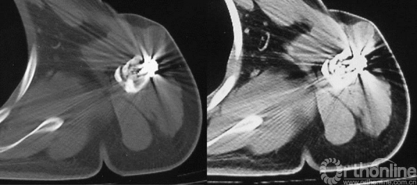 图13-9 病例一入院时CT轴位骨窗、软组织增强窗(第一次术后6个月)