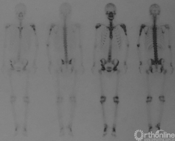 图13-10 病例一入院时99mTc全身骨扫描(第一次术后6个月)
