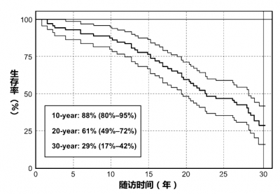 图1 PAO术后随访30年生存率情况。终点事件:接受关节置换术(THA)、骨关节炎进展、Merle d'Aubigné-Postel评分<15