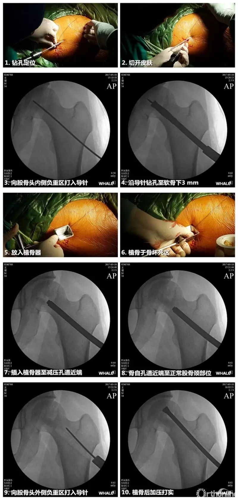 总结自己20年的临床经验,郭晓忠主任毫无保留地向大家详细讲解了“微创的经大粗隆单一入路双孔道减压植骨+结构性骨支撑手术”的手术方法。该手术的主要步骤包括:手术经大粗隆单一入路,沿股骨颈减压至股骨头内侧负重区,植入异体松质骨,并加压打实。沿股骨颈外侧减压至股骨头外侧负重区,植入异体松质骨,并加压打实。测量外侧减压孔道长度,植入羟基磷灰石聚酯棒结构性骨支撑棒。
