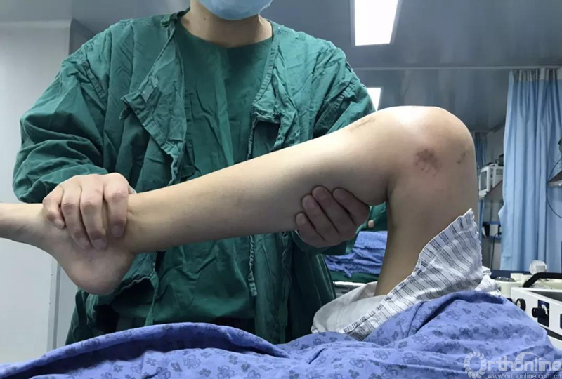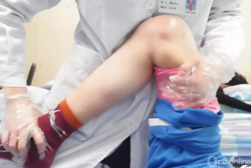 接下来的麻醉过程顺利。麻醉后检查膝关节活动度未见明显改善,考虑还是右膝关节部分组织粘连,而非肌肉紧张疼痛造成的活动受限。术中首先放松右膝关节周围肌肉,上下左右推动髌骨。松解术中可闻及“啪啪”的撕裂声。随着松解的进行,右膝关节的的活动角度已到达125°,并且没有髌骨的异常活动,手法松解达到预期目的。这让患者对术后的恢复充满信心。