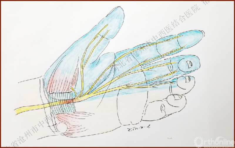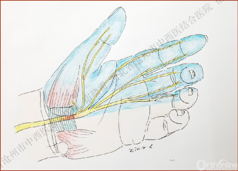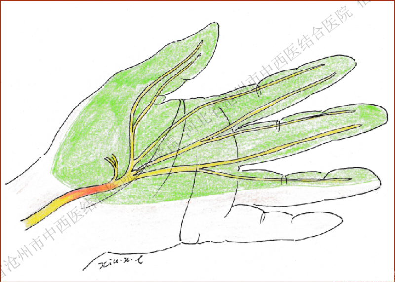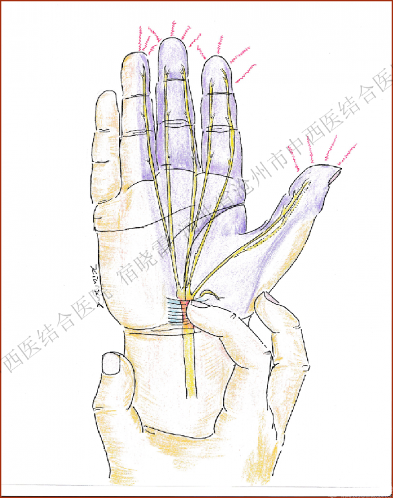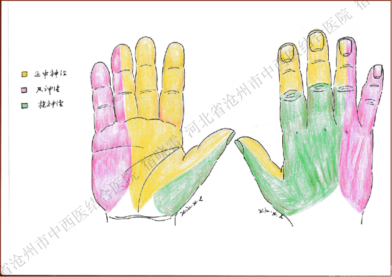 周围神经卡压造成手麻为三根神经支配区麻木、疼痛。