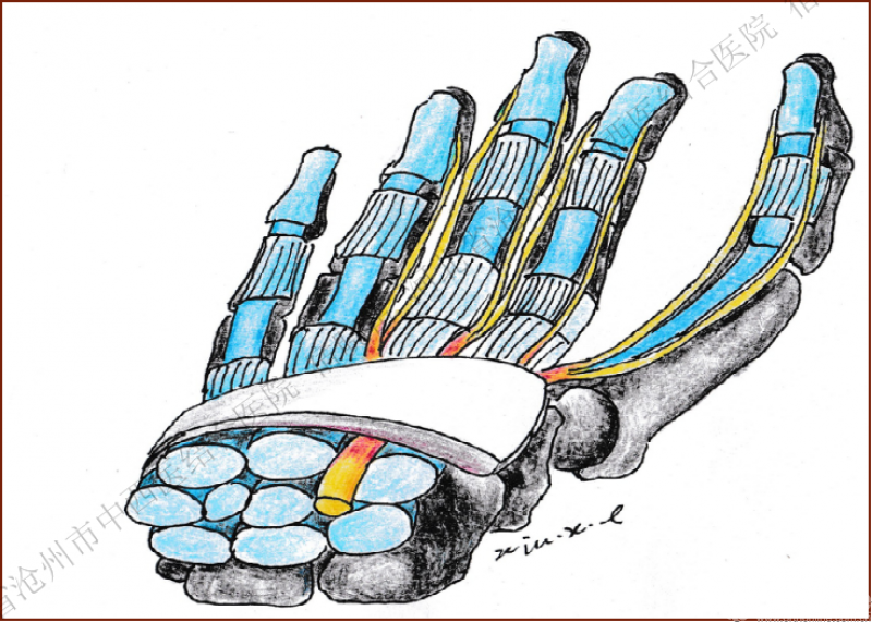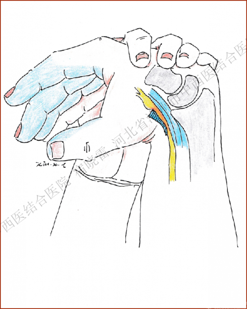 术后石膏固定腕关节于中立位3周,主动屈伸手指,防止肌腱粘连。