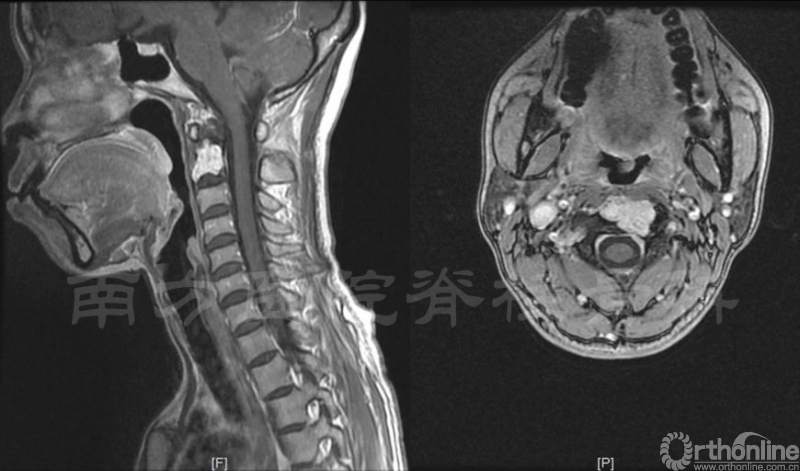 术前MRI示肿瘤侵犯枢椎大部分椎体