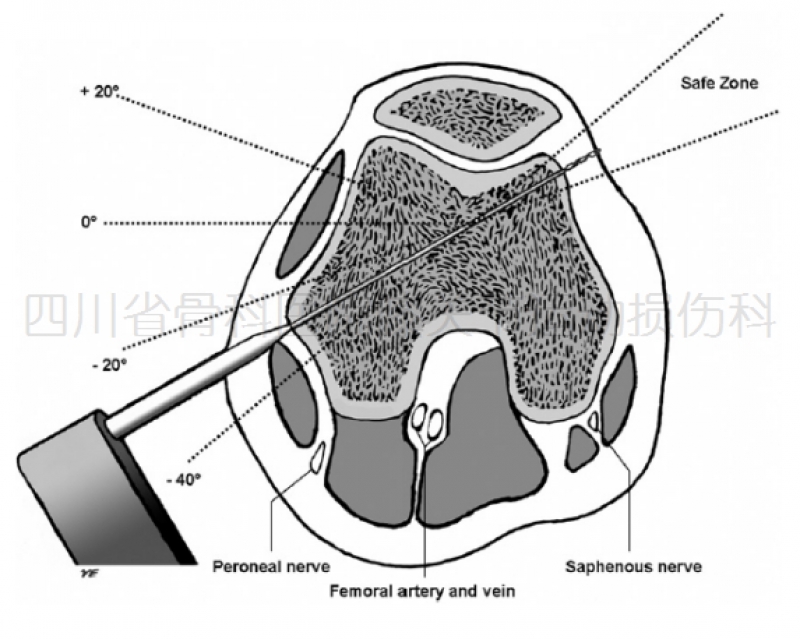 前交叉韧带(Anterior cruciate ligament, ACL )股骨隧道腱-骨横穿固定技术(Cross- pin fixation),兼具隧道外皮质骨悬吊固定和隧道内出口挤压螺钉固定之优点:横穿固定点靠近ACL股骨止点区,且终末抗拉强度与皮质骨悬吊固定相当。缺点:在横穿钉穿入股骨髁而横跨骨隧道的过程中,可发生击入点,击入路径及出口区膝周神经、血管及肌腱、韧带,甚至软骨等重要结构之医源性损伤。有学者提出了股骨横穿固定之“安全区(Safezone)”,即击入点、击入方向及出口区之安全范围。实践证明,在安全区内,医源性损伤可以避免。
