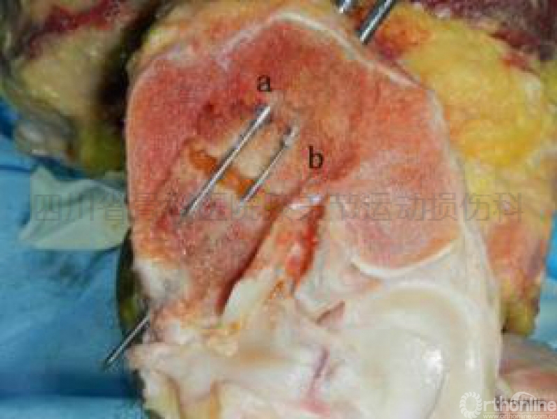 图示四经前内入口安全区逆向横穿于股骨内髁击入区所见:a、b点为RigidFix