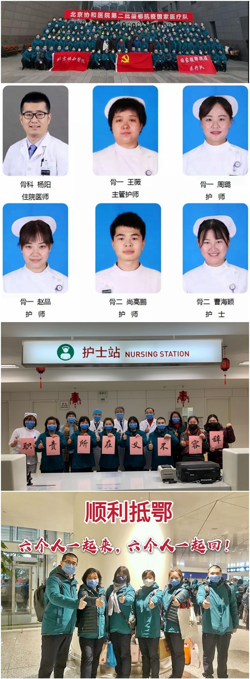 2月7日,北京协和医院第二批援鄂抗疫国家医疗队142名队员带着全院职工的殷切嘱托与祝福乘机驰援武汉。其中有6名骨科医护人员,他们是骨科杨阳住院医师、骨一病房王薇主管护师、周璐护师、赵晶护师、骨二病房尚高鹏护师和曹海颖护士。