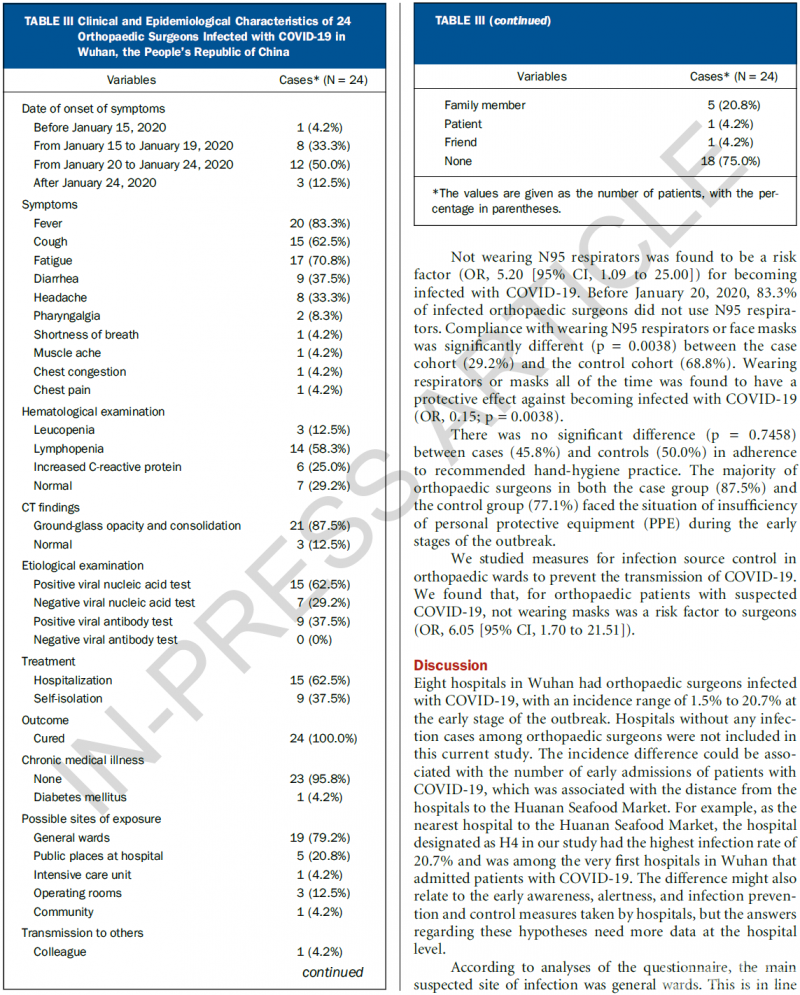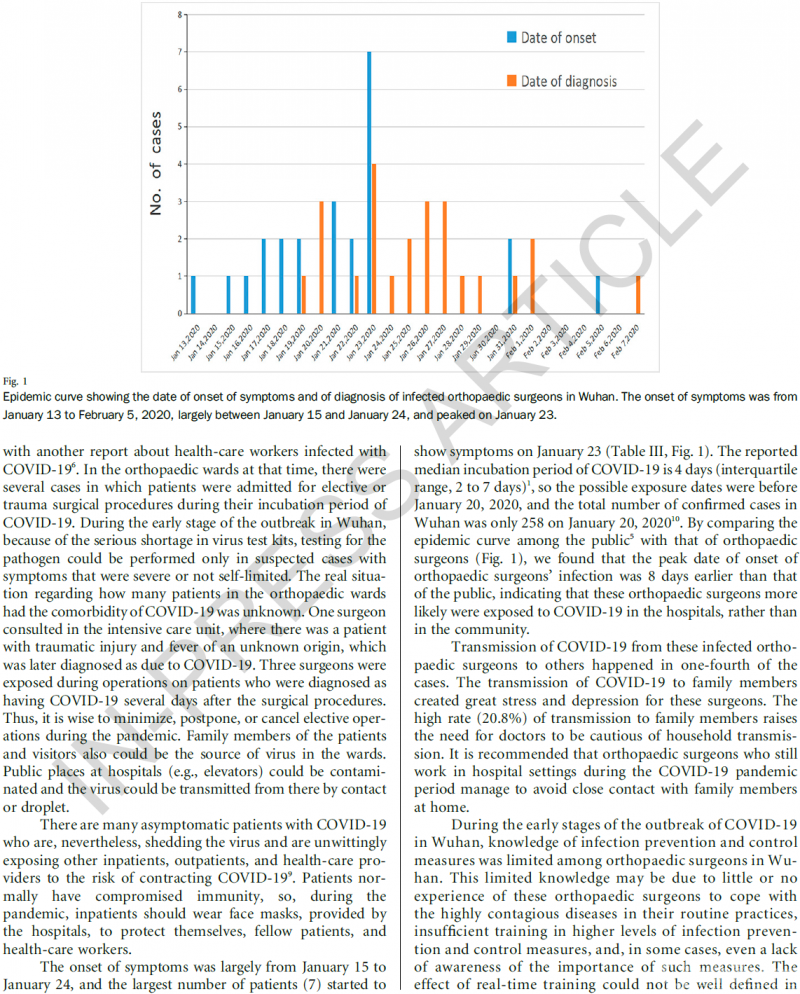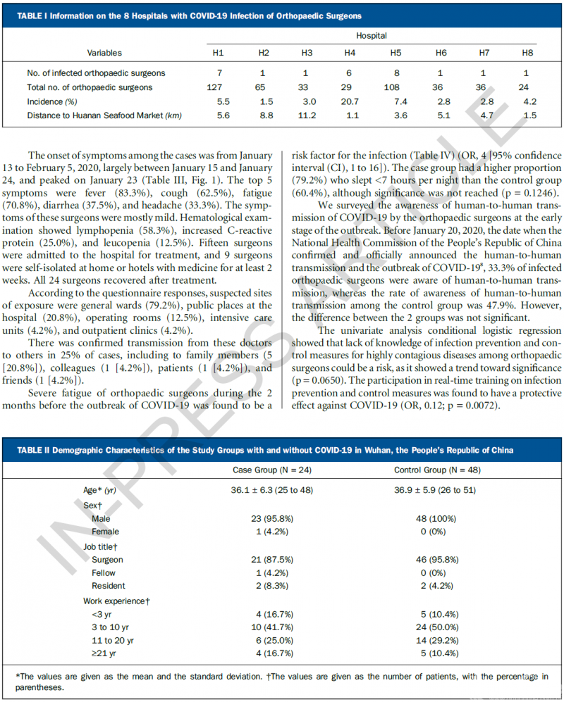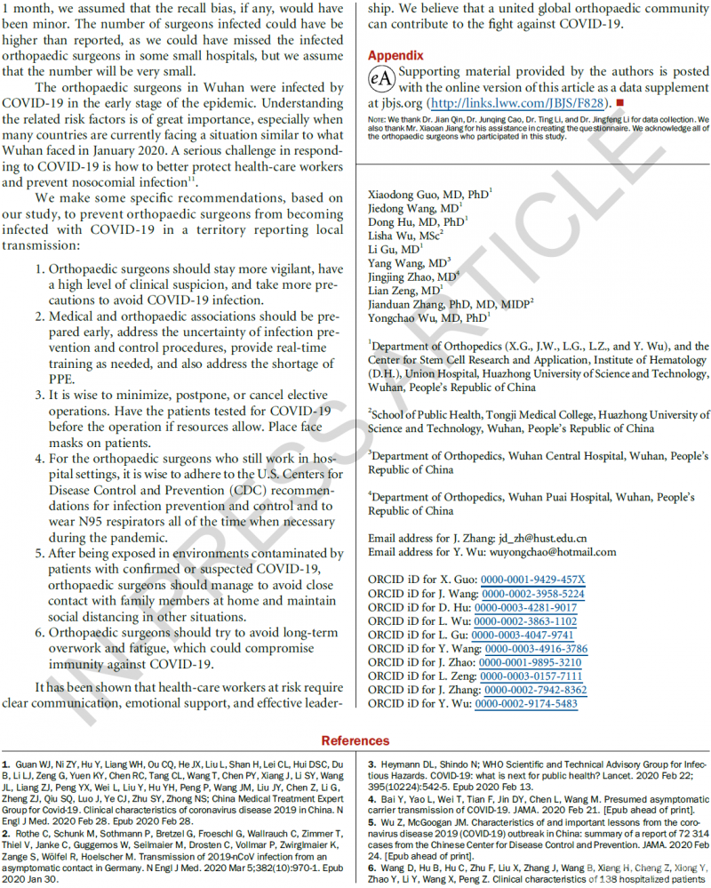 Xiaodong Guo, Jiedong Wang, Dong Hu, Lisha Wu, Li Gu, Yang Wang, Jingjing Zhao, Lian Zeng, Jianduan Zhang, Yongchao Wu. Survey of COVID-19 Disease Among Orthopaedic Surgeons in Wuhan, People's Republic of China. The Journal of Bone & Joint Surgery, 2020.DOI:10.2106/JBJS.20.00417.