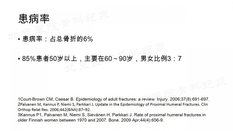 肱骨近端骨折约占全身骨折的6%,多发生于老年人,低能量损伤造成骨质疏松性骨折,在脆性骨折的发病率中仅次于脊柱压缩骨折、桡骨远端骨折居第三位,它严重影响肩关节的功能,但只有约20%的移位较大的骨折需要手术治疗。