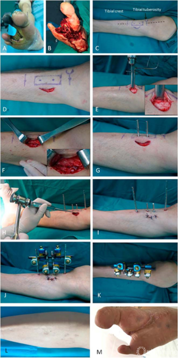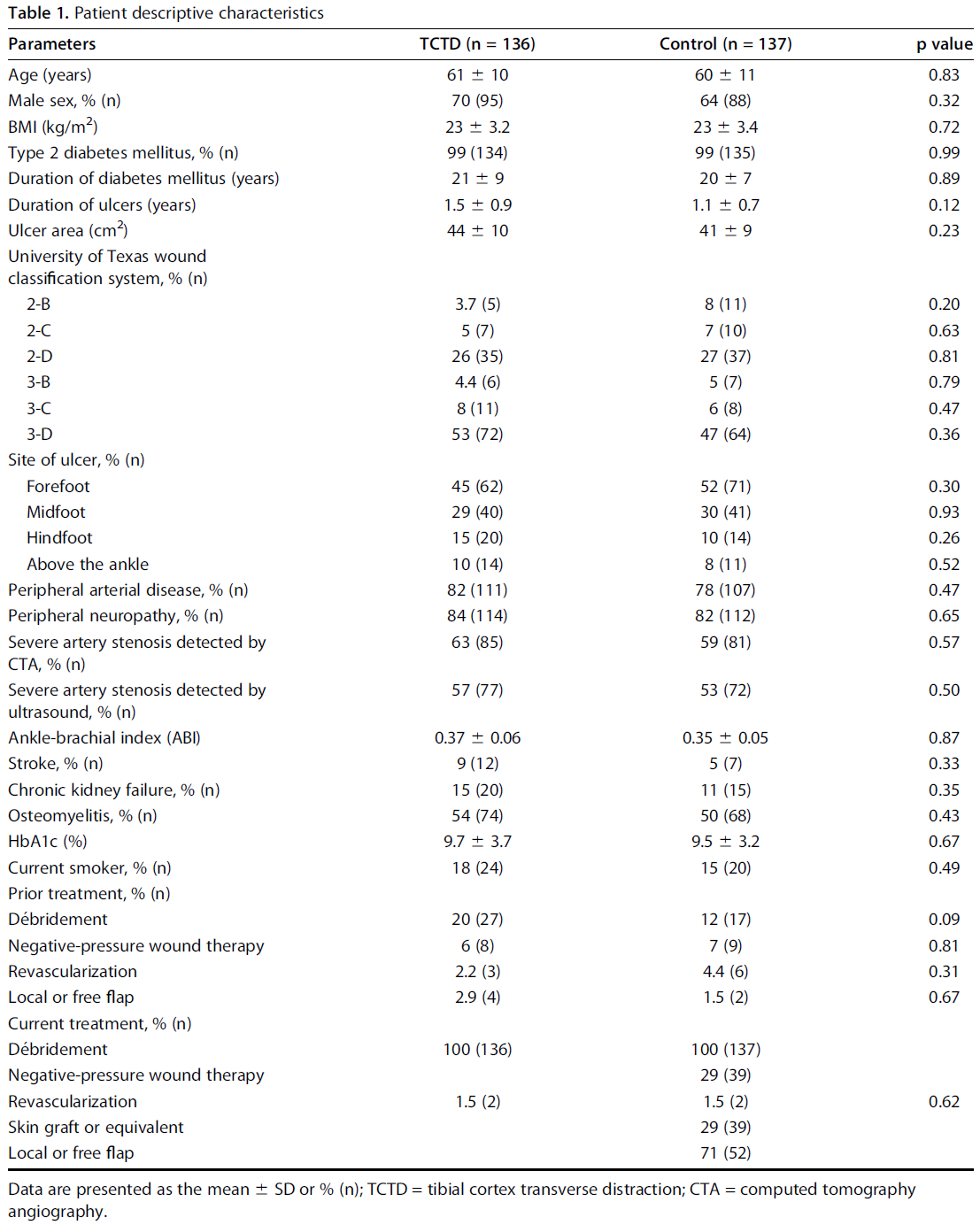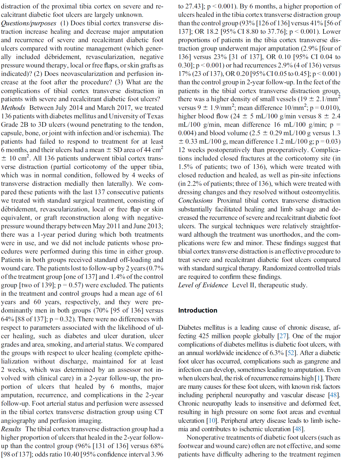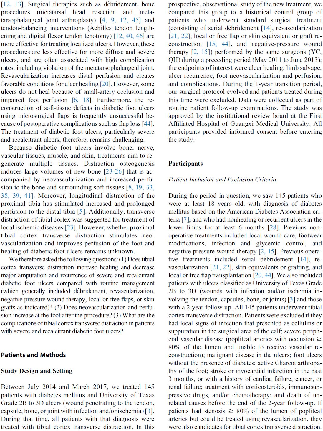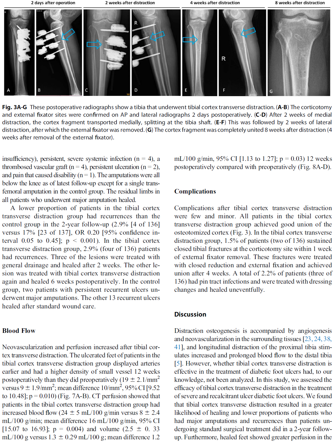 在此项临床研究中,该团队于2014年7月至2017年3月间,对136例Texas分级2B至3D的患者(溃疡平均面积为44cm2±10cm2)进行胫骨横向骨搬移手术,术后患者仅接受常规换药处理及标准护理措施,并将这些患者与在2011年5月至2013年6月之间采用标准外科手术治疗的137例重度糖尿病足患者进行了比较,这些患者接受了清创,血运重建,局部或游离皮瓣或移植重建手术以及负压伤口等治疗手段。