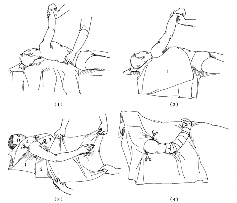 ③用一大无菌单自腋窝顶平面向手术台尾端展开,铺盖胸、腹部和两下肢。手术者和助手同时提起一条两端对折的中单的四角,托着护士放下的上肢,包裹该上肢,并用绷带包扎后放在患者胸、腹部前外侧(图2-3-15(4))。