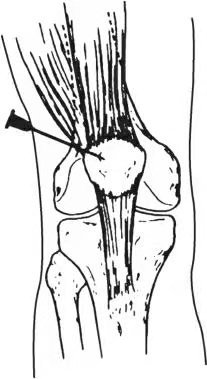 膝关节表浅容易穿刺。进针点在髌骨上极平面、髌骨外侧缘,通过外侧支持带进入关节腔(图20-0-6)。