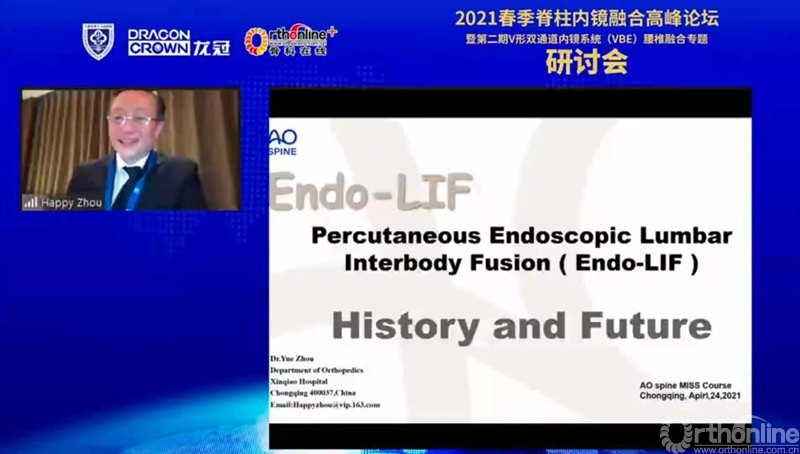周跃教授全面系统地回顾了经皮内镜腰椎融合技术的发展历史,并依据脊柱内镜的设计原理及操作特点,对当前的内镜技术进行了分类。他通过演示动画等方法,十分形象立体地展示、对比了当下流行的脊柱内镜融合技术的解剖入路及手术操作特点等。周教授肯定了国内诸多团队对脊柱微创手术技术的发展所做出的贡献,并结合相关技术发展历史及现状,对未来发展方向做出预判。