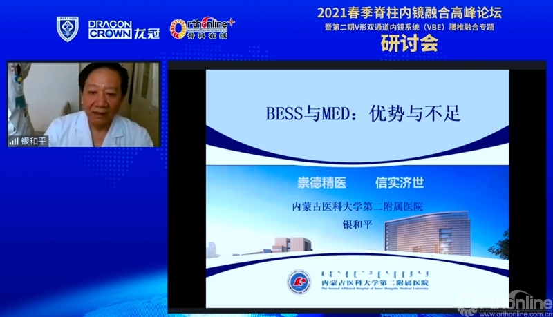 银和平教授结合其独具特色的椎间盘镜(MED)手术技术,同大家分享了MED辅助下腰椎微创融合手术经验,对比分析了BESS与MED手术的优势与不足,对脊柱内镜融合提出深刻的见解。
