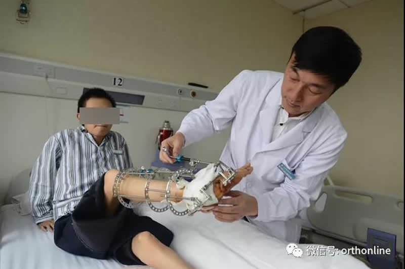 这正是杨华清教授要攻克的难题,经过多年的研究、探索和改进,杨华清教授带领团队创新设计了“微创骨外固定肢体再生控制技术”与“肌骨加速康复治疗技术”。这个技术是在Ilizarov(伊利扎诺夫)肢体矫形术的基础上进行了改进和优化,先通过可调节支具进行外固定,在体外缓慢持续地进行牵拉,使人体组织在应力的刺激下再生。无须穿针、无须开刀,大大减轻了患者的痛苦,治疗成功率也明显提高。