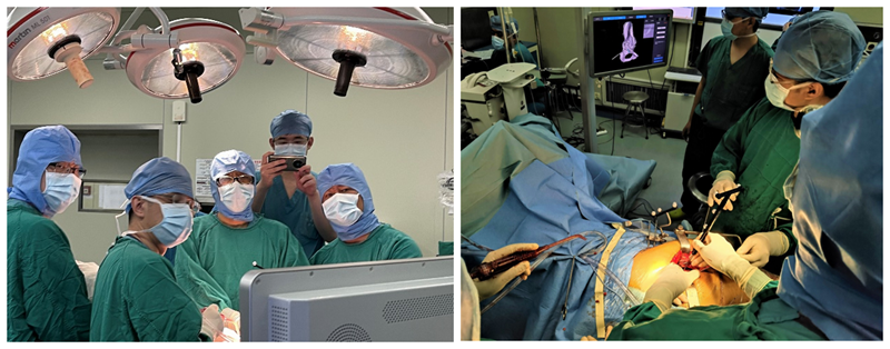 图6 田华主任和李锋教授在术中使用导航进行骨盆注册