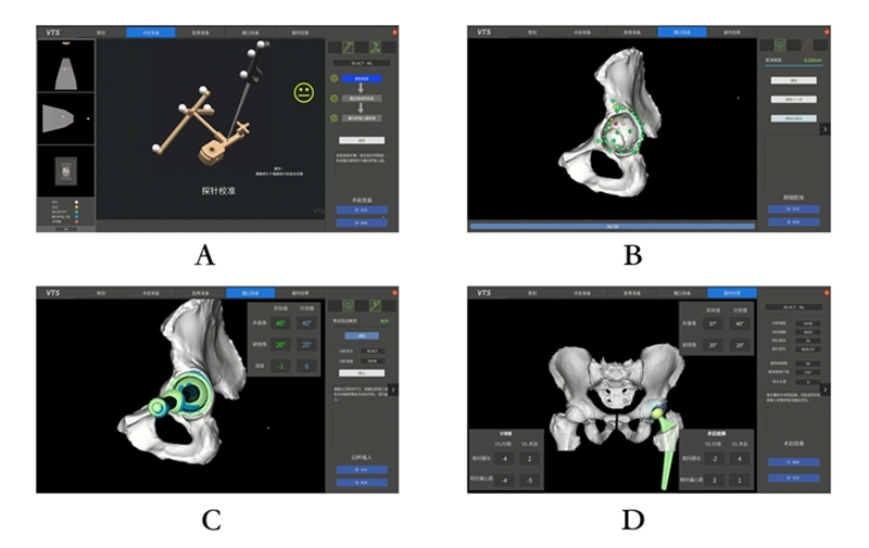 图2 导航流程 A:器械校准;B:髋臼注册及配准;C:臼杯安装;D:术后整体情况