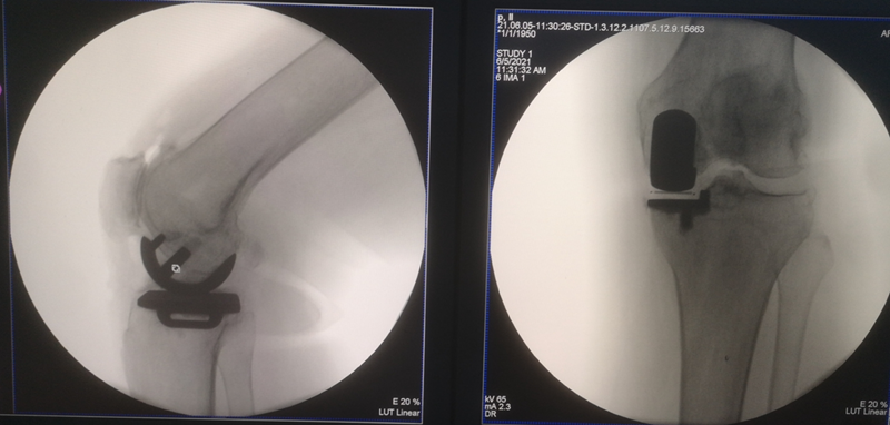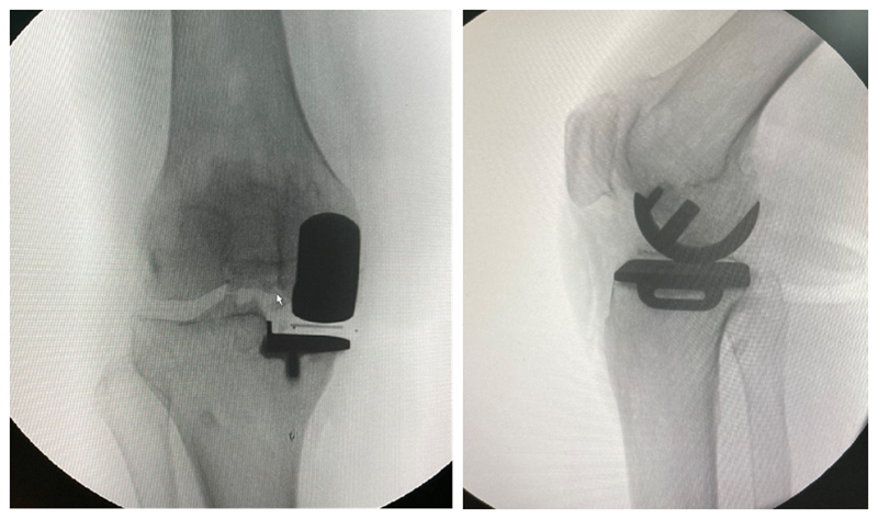 严重内翻畸形需要明确畸形原因,对于骨缺损明显,膝关节僵直畸形,合并内侧副韧带挛缩,畸形>20°病例不适合。对于在外翻应力位可以矫正的关节内的内翻畸形,只要前交叉韧带完整,仍然可以谨慎选择UKA。术前仔细评估骨质磨损深度,骨缺损,内侧副韧带张力及膝关节稳定性。备好全膝关节假体。术中注意避免截骨过深,导致间隙过大,常规厚度假体不能满足需要。骨质缺损较多一般推荐使用固定垫片假体。注意保护内侧副韧带,避免截骨损伤。