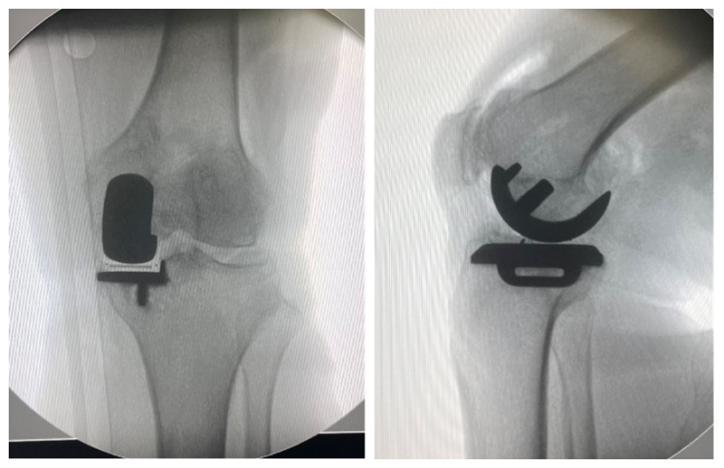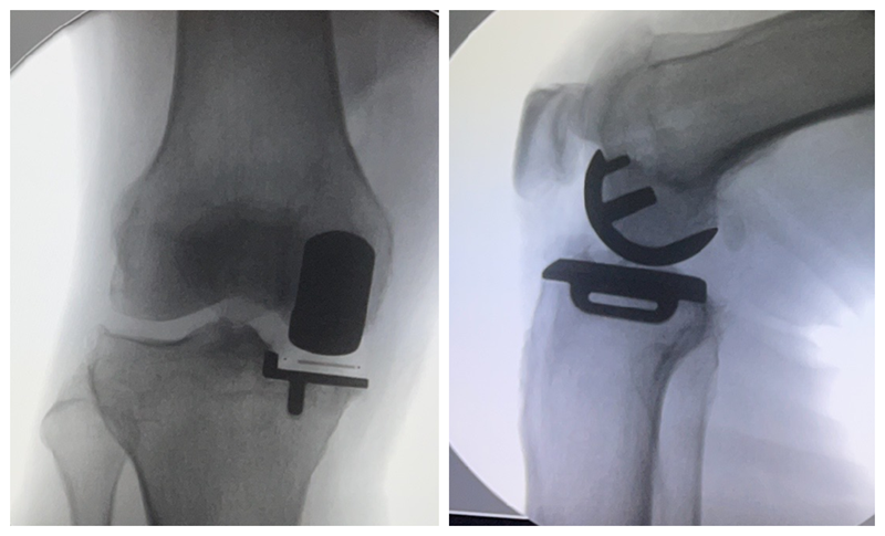 现阶段生物型单髁假体也逐步被越来越多医生与患者选择。对于生物型假体,需要注意以下几点:(1)垂直截骨开槽避免用常规骨水泥型假体工具,以免开槽过宽导致假体置入松动。(2)开槽过程中需要特别谨慎小心,敲击力度适宜,以防胫骨劈裂骨折。(3)年龄大,骨质疏松明显以及股骨髁坏死病例用生物型假体应更加慎重。