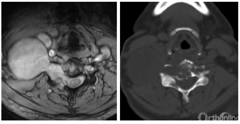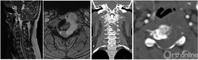 病人的核磁和CT显示了一个以C3-4椎间孔为中心的哑铃型肿瘤,并且伴有C3和C4椎体的骨质破坏(图1)。这些片子给我的第一印象也是神经源性肿瘤。伴有椎体破坏的神经鞘瘤并不少见,比如下面这个病例就是一个经过手术证实的累及椎体的哑铃形神经鞘瘤(图2)。