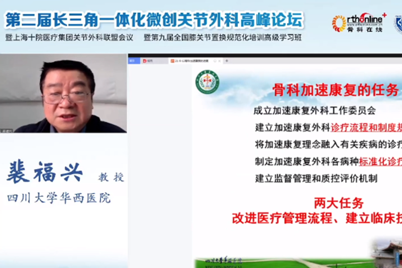 四川大学华西医院裴福兴教授通过线上分享了《骨科加速康复发展》的内容。他分享了加速康复实施的背景及面临的挑战,从多方面介绍了ERAS理念的起源与定义,以及目前中国ERAS工作发展的具体要求、研究方向和理念技术等。指出应当改进医疗管理流程,建立医疗技术规范,探索出以病人为中心多学科融合的模式,助推中国加速康复外科发展。