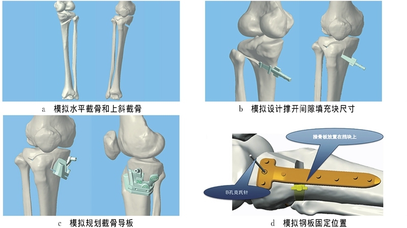 图2 计算机术前规划图 a.模拟水平截骨和上斜截骨;b.模拟设计撑开间隙填充块尺寸;c.模拟规划截骨导板;d.模拟钢板固定位置