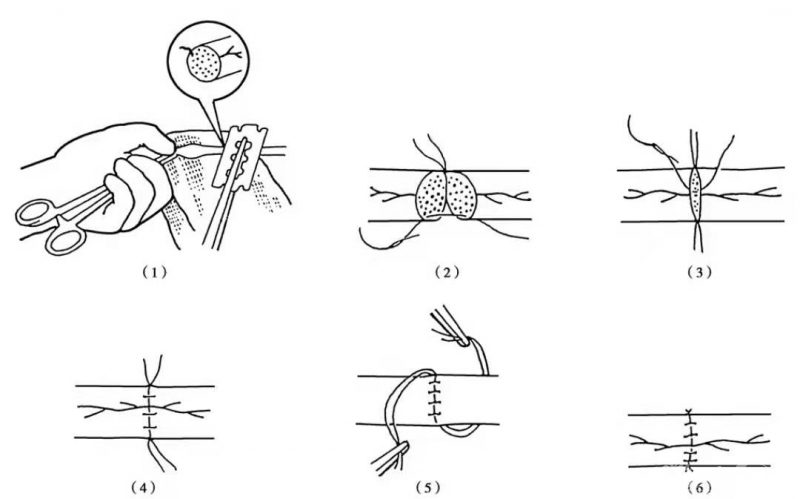 ①将受、供两神经的近侧断端按前述的显微神经外科技术处理后,在手术显微镜或手术放大镜下,用神经束膜缝合法作对端缝合。然后从缝合处起,按所需移植的长度再加3cm切断供神经。切断方法是,在镜下纵行切开神经外膜2~3cm向两侧翻开,沿膜下游离神经干,并将其切除1cm,所遗空隙用附近的软组织填充,以防近端的神经纤维再长入远端。注意勿损伤位于外膜中的营养血管。这样,供神经中的移植段便发生Waller变性,受区神经中的神经纤维便长入其内。