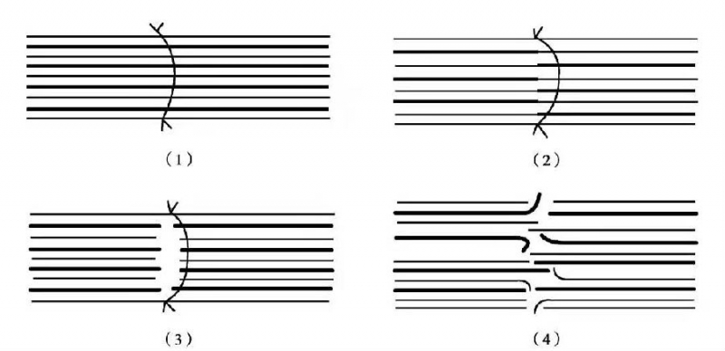 图2 神经外膜缝合术神经束断端结果(1)正常;(2)感觉与运动神经错位;(3)分离;(4)突出、叉开、扭曲