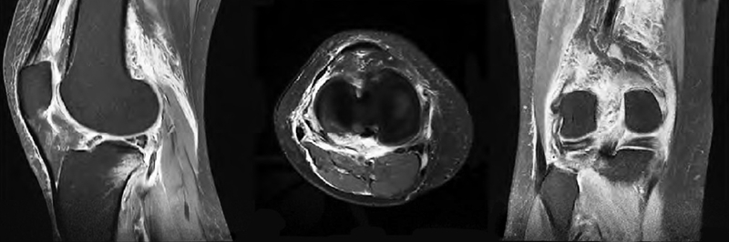 图2 术前矢状面、横断面、冠状面 MRI示外侧半月板三度损伤