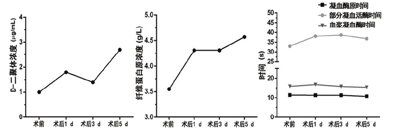 图5 术后第1天患者各凝血功能指标提示处于高凝状态