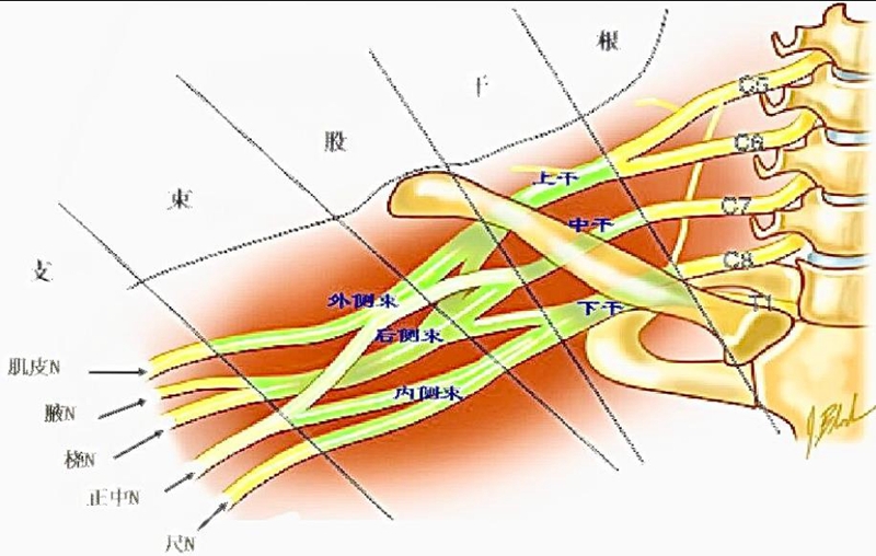 臂丛神经由“根、干、股、束、支”组成。