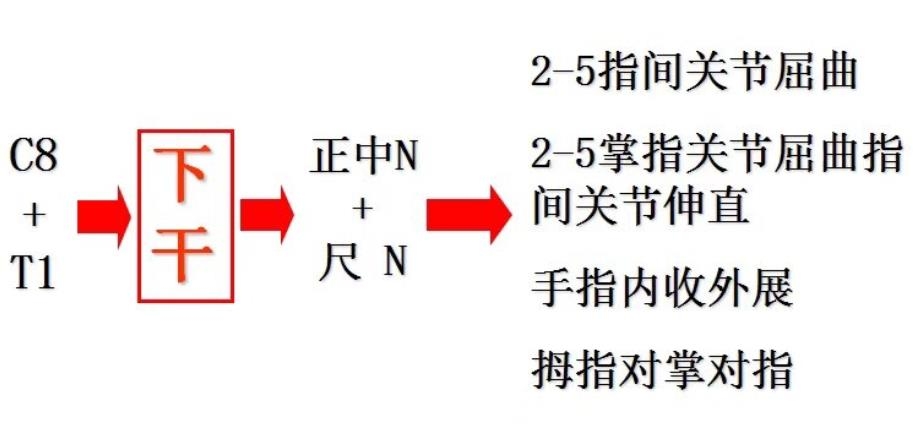 C8+T1=下干,主要功能是屈指+拇对掌对指+手内在肌功能。