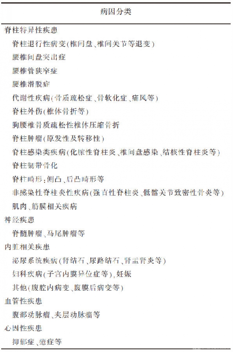 特异性LBP的病因主要包括6类,即脊柱特异性疾患、神经疾患、内脏系统疾患、血管性疾患、心因性疾患及其他因素(表2)[1、10、44]。