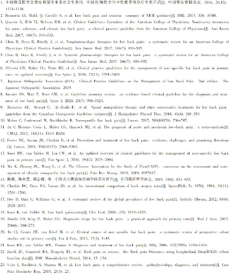 近5年来,国内和国际上发表了多篇有关LBP的诊疗指南和共识,主要包括中国康复医学会脊柱脊髓专业委员会专家组2016年制定的《中国急/慢性非特异性腰背痛治疗专家共识》[1]、2017年英国国家健康和保健医学研究所(the National Institute for Health and Care Excellence,NICE)制定的《腰背痛与坐骨神经痛NICE指南》[2],2017年美国医师协会与疼痛协会发布的《急性、亚急性和慢性腰背痛非侵入性管理临床实践指南》[3]、《腰背痛的非药物治疗临床实践指南》[4]、《腰背痛药物治疗临床实践指南》[5],2018年在欧洲脊柱外科杂志上发表的《初级保健卫生机构非特异性腰背痛的临床实践指南更新》[6],2019年日本骨科学会发布的《腰背痛诊疗指南(第2版)》[7],2020年北美脊柱外科学会发布的《腰背痛诊疗指南》[8]。此外还包括针对LBP某一特定治疗方法所发布的指南,如2018年加拿大脊柱神经学会发表的《对于腰背痛的脊柱手法治疗和其他保守治疗指南》[9]。