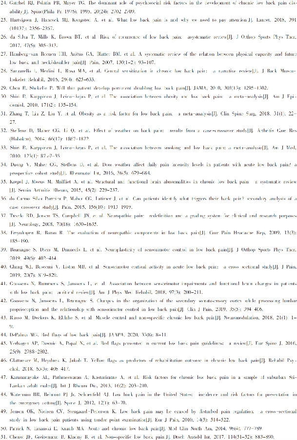 LBP:LBP是一种以症状命名的疾病[7、10],临床上对于腰背部的疼痛、不适等症状统称为腰背痛,该症状可能和多种病理情况及疾病相关,或找不到明确的致病因素[6]。